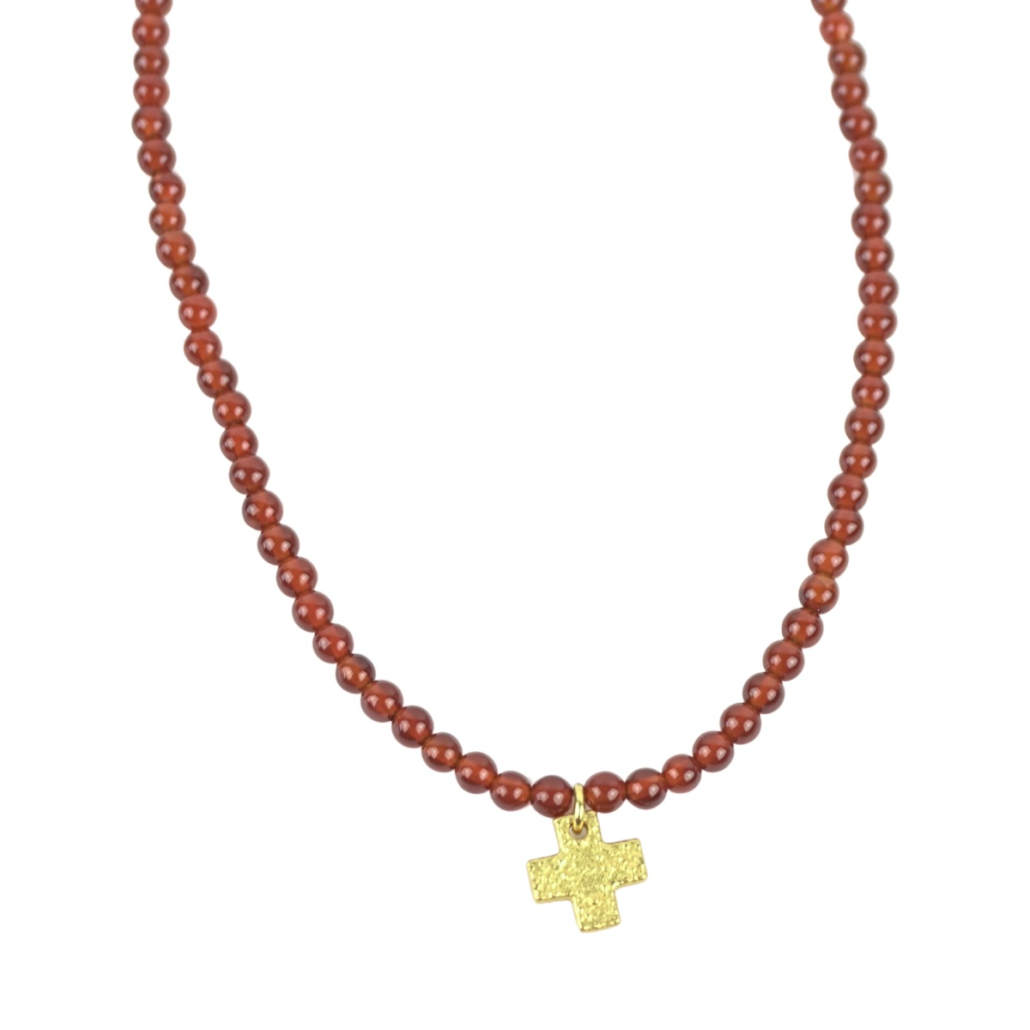 God is good! A WPD original design with small dappled cross. 22k Gold plated 12MM pendant on 16″ necklace of smooth Carnelian rounds with 1″+ GF extender chain. Simply the best!