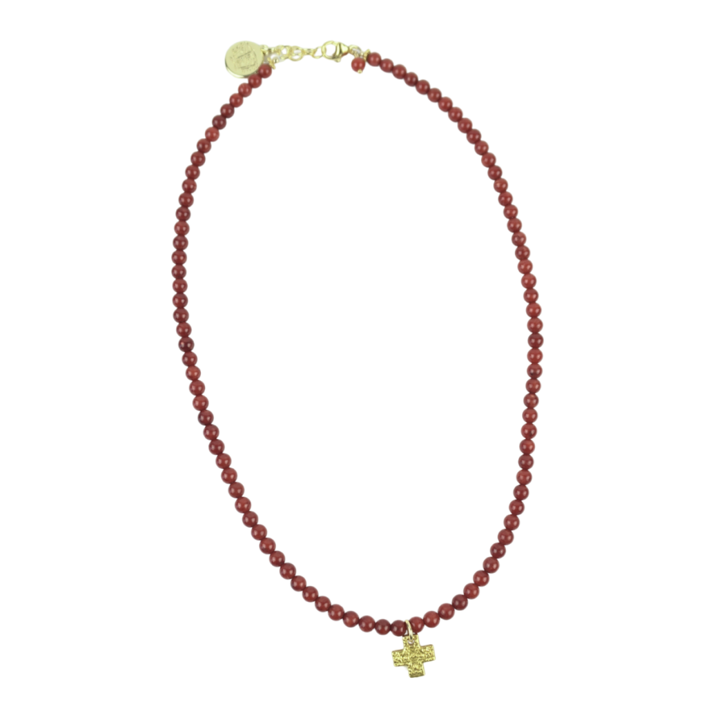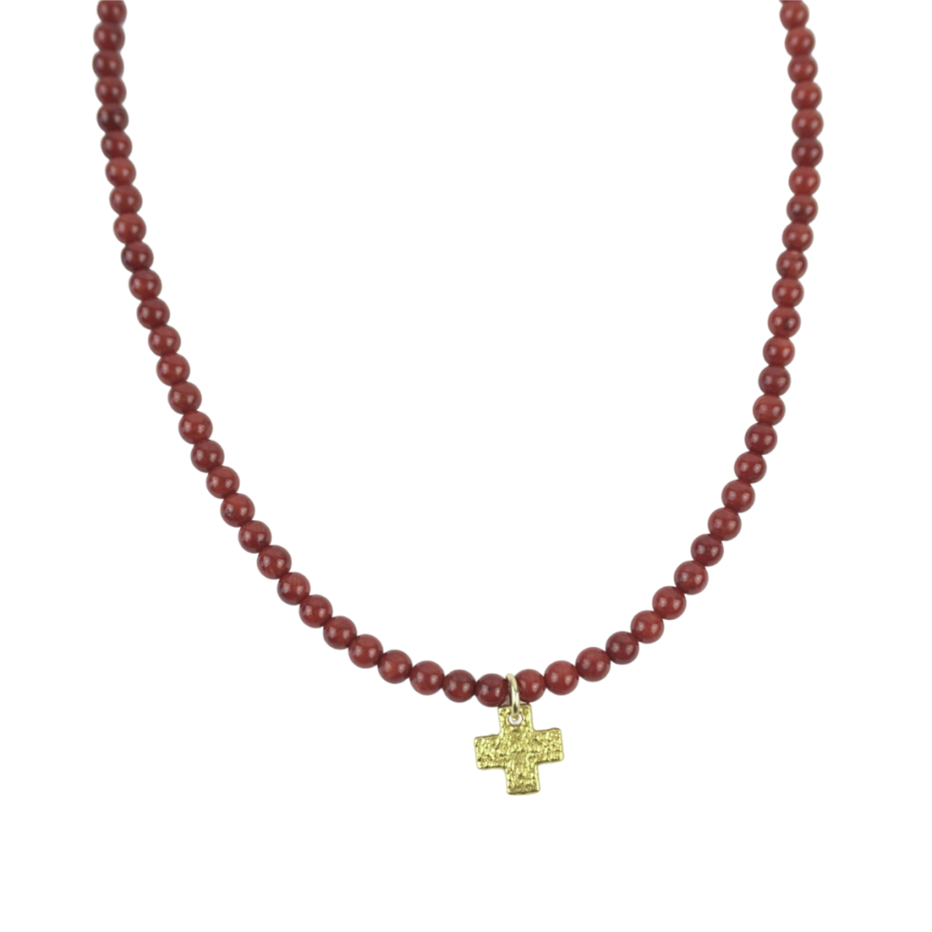God is good! A WPD original design with small dappled cross. 22k Gold plated 12MM pendant on 16″ necklace of smooth Coral rounds with 1″+ GF extender chain. Simply the best!