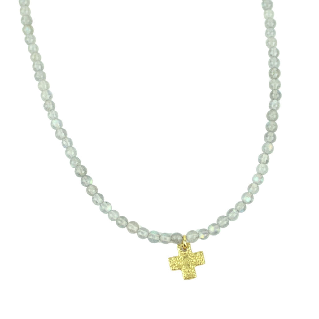 God is good! A WPD original design with small dappled cross. 22k Gold plated 12MM pendant on 16″ necklace of smooth Labradorite rounds with 1″+ GF extender chain. Simply the best!