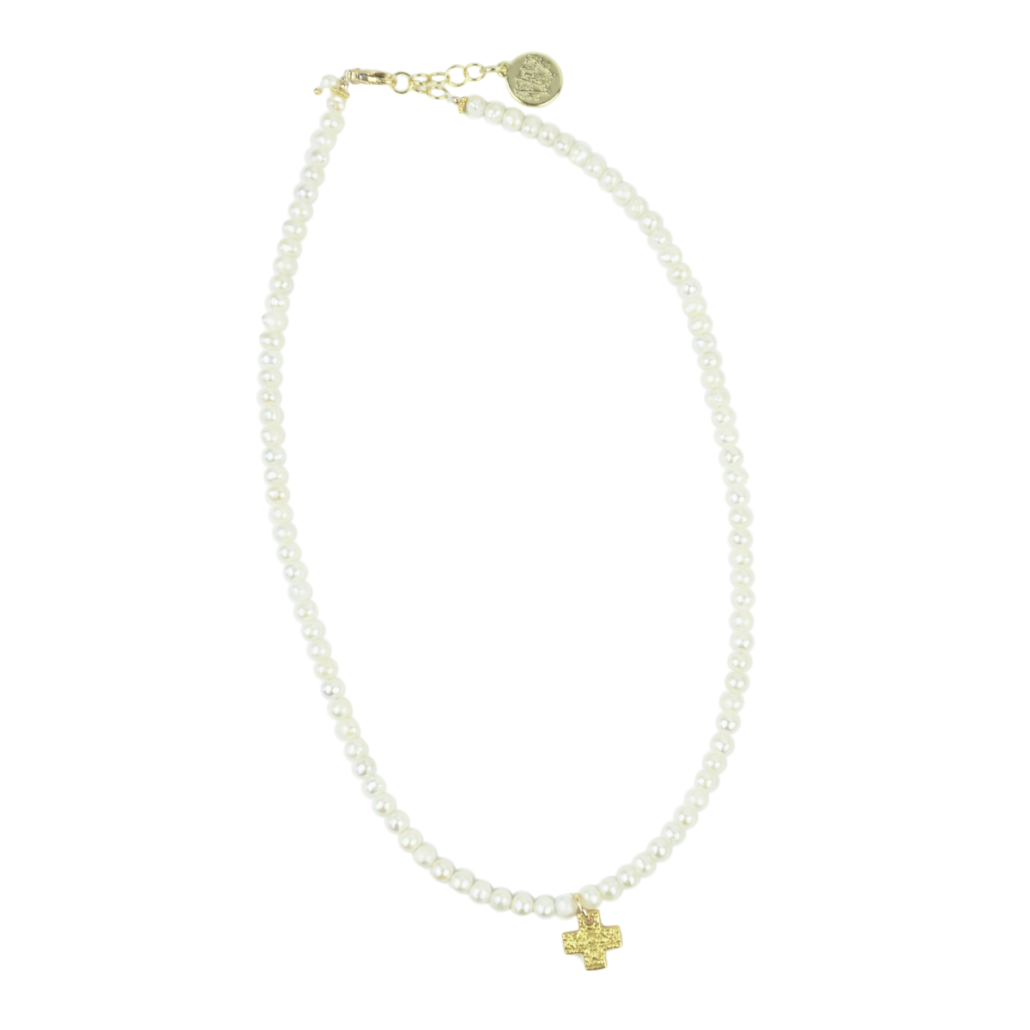 God is good! A WPD original design with small dappled cross. 22k Gold plated 12MM pendant on 16″ necklace of smooth Pearl rounds with 1″+ GF extender chain. Simply the best!