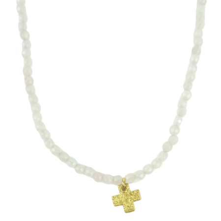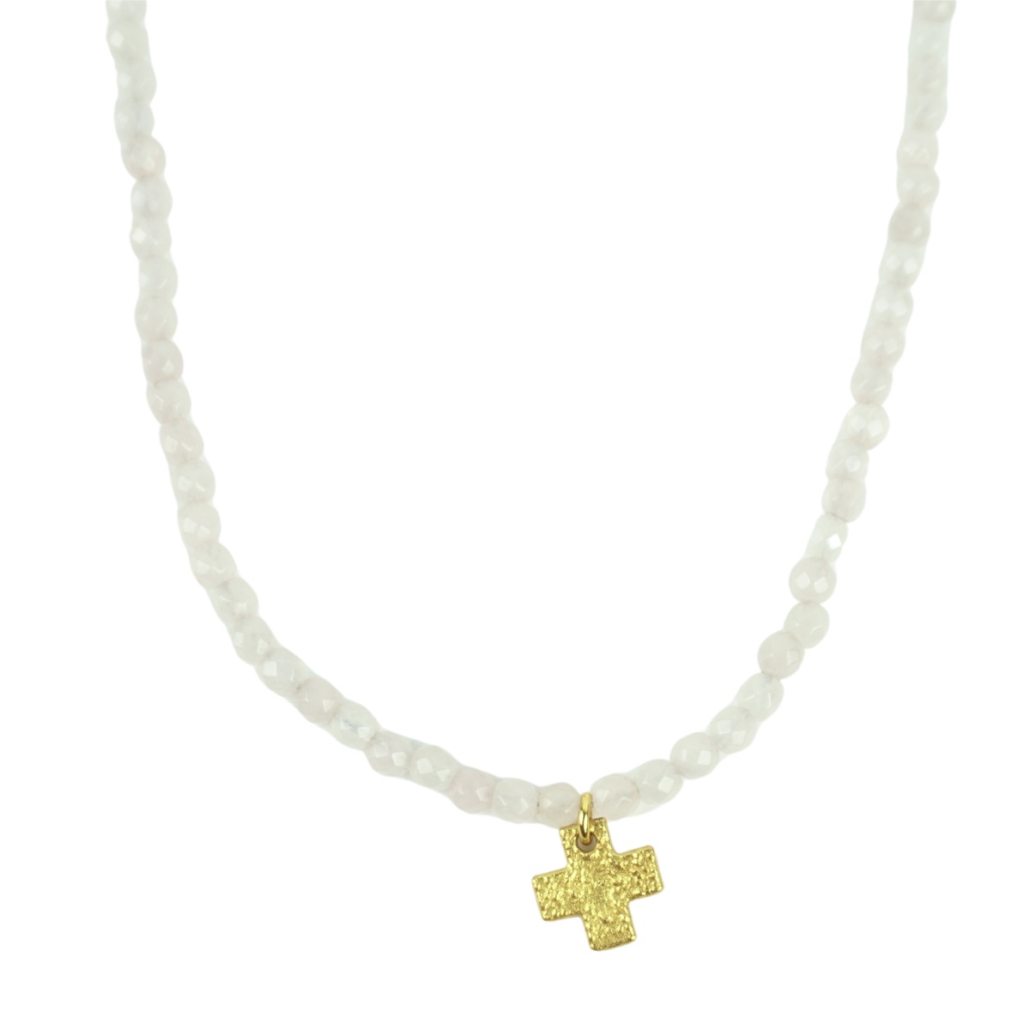 God is good! A WPD original design with small dappled cross. 22k Gold plated 12MM pendant on 16″ necklace of faceted Rose Quartz rounds with 1″+ GF extender chain. Simply the best!
