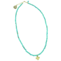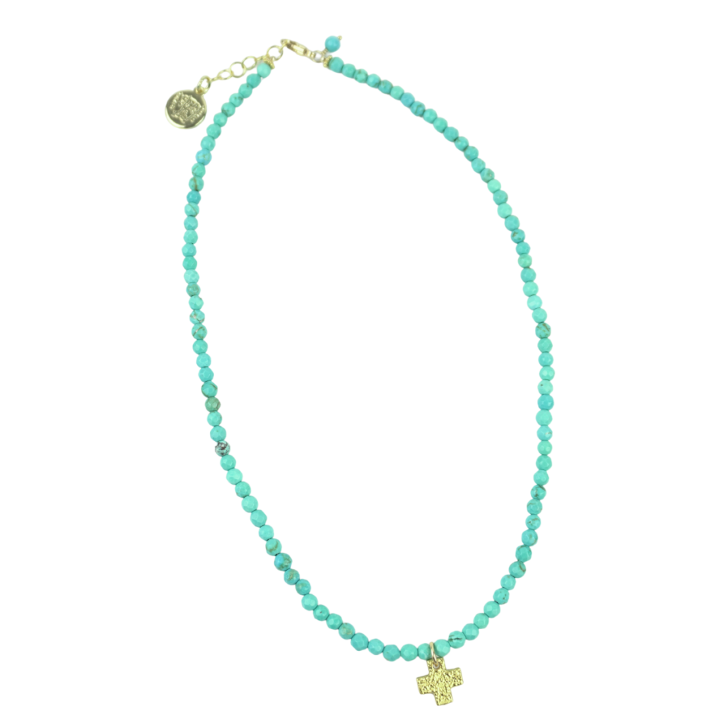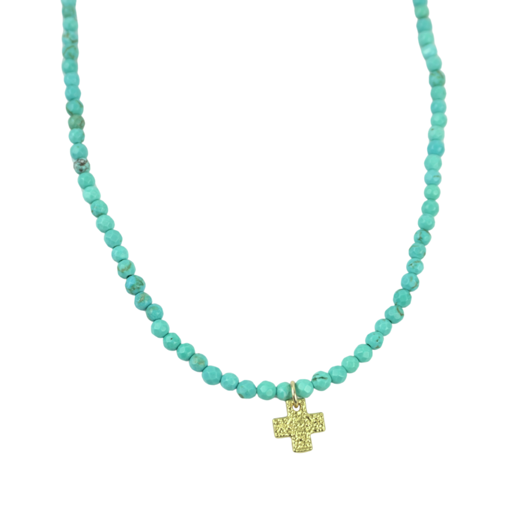 God is good! A WPD original design with small dappled cross. 22k Gold plated 12MM pendant on 16″ necklace of faceted Turquoise rounds with 1″+ GF extender chain. Simply the best!