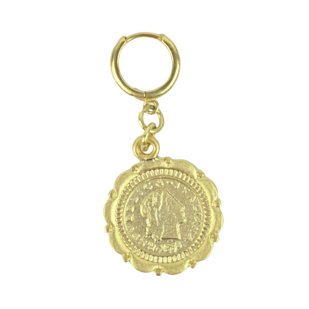 Excited to add coins to our collection of removable charms! This approximately 25mm gold plated version is Italian and has a scalloped edge with we love! These can be added and subtracted to any chain by simply opening the clasp which is reminiscent of a hoop earring. Complete a necklace you already have in your collection or add to any of our chains including our Favourite Pearl Necklace!
