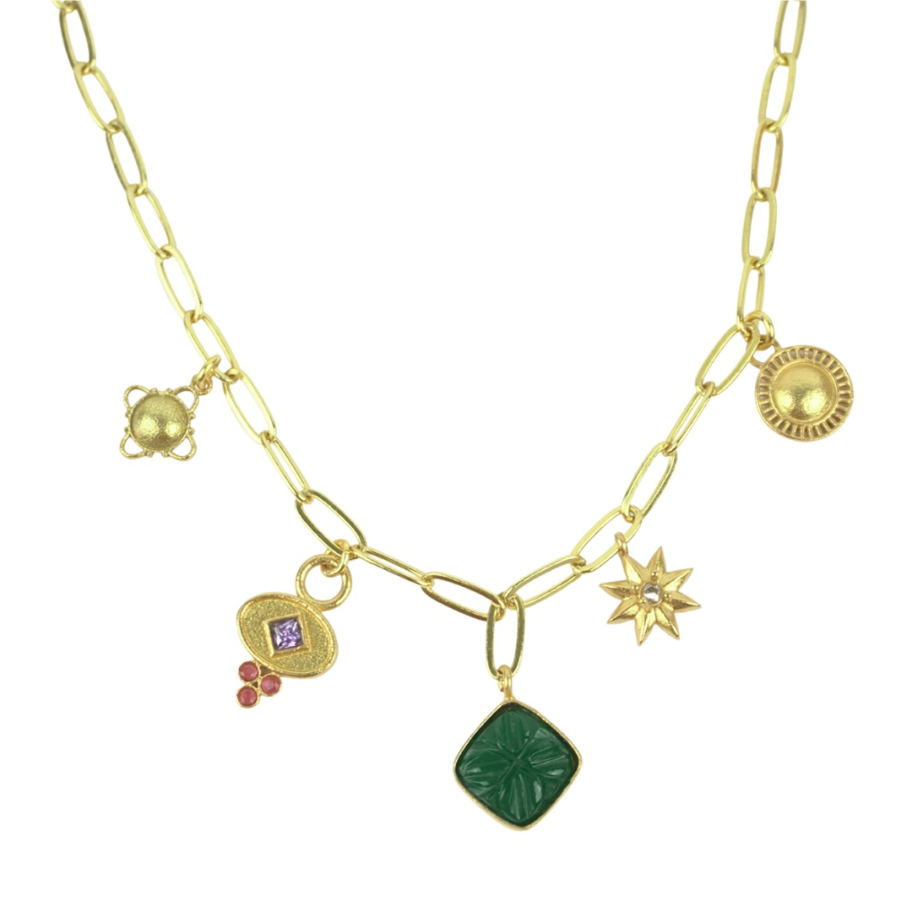 Lyon is one of Wendy’s favourite places for a reason – and it’s not just because it is the gastronomique capital of the world! It’s simply the best place for antiquing!!! The charms designed for this necklace are reminiscent of the treasures she’s found in this lovely French city. The charms include accents of Amethyst, Pink Ruby, Green Onyx and Crystal Quartz. The 22kt GP paperclip chain is versatile in length by utilizing the lobster clasp – up to 23″.