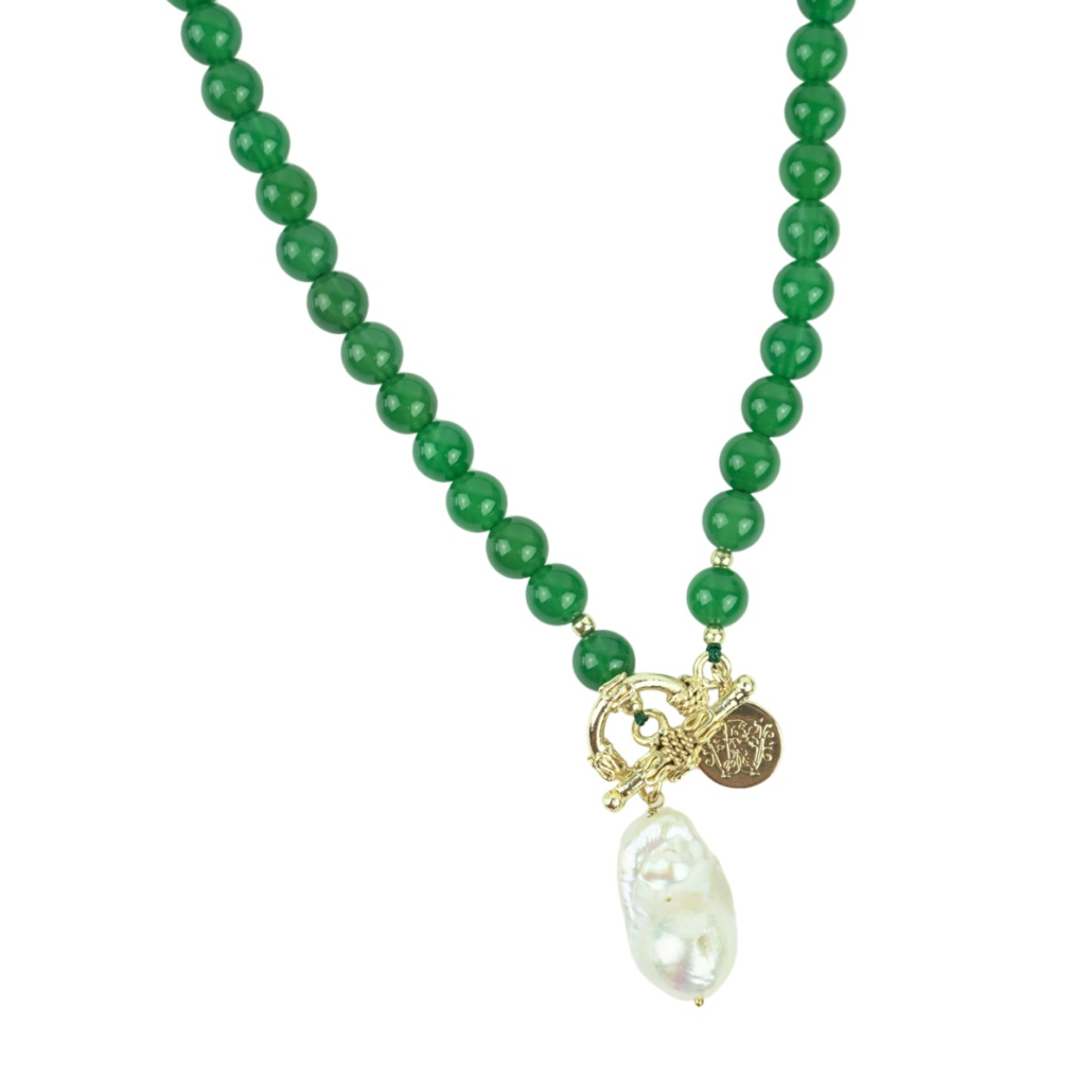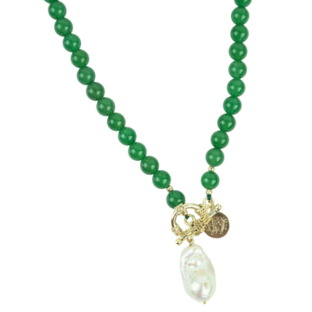 The Traber necklace is the entire package – wrapped up with a bow! Gorgeous smooth semiprecious stones with 22kt GP toggle and stunning baroque pearl pendant! Perfectly punctuates any ensemble whether a white t or a dressy dress!