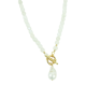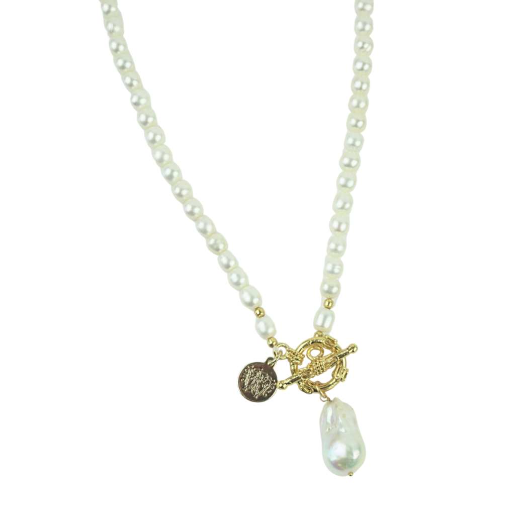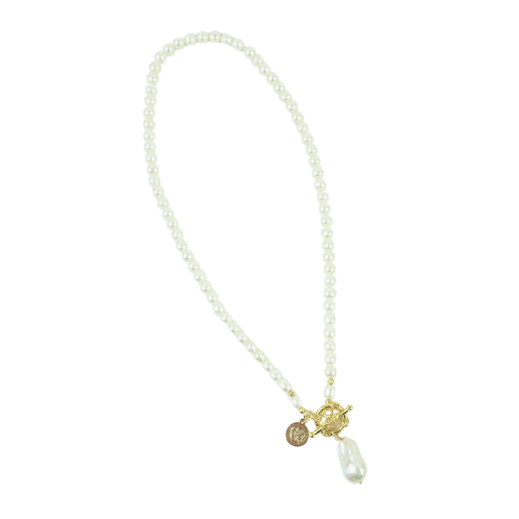 The Traber necklace is the entire package – wrapped up with a bow (& a lovely Baroque Pearl!)! Gorgeous round white pearls with 22kt GP toggle and stunning baroque pearl pendant! Perfectly punctuates any ensemble whether a white t or a dressy dress!