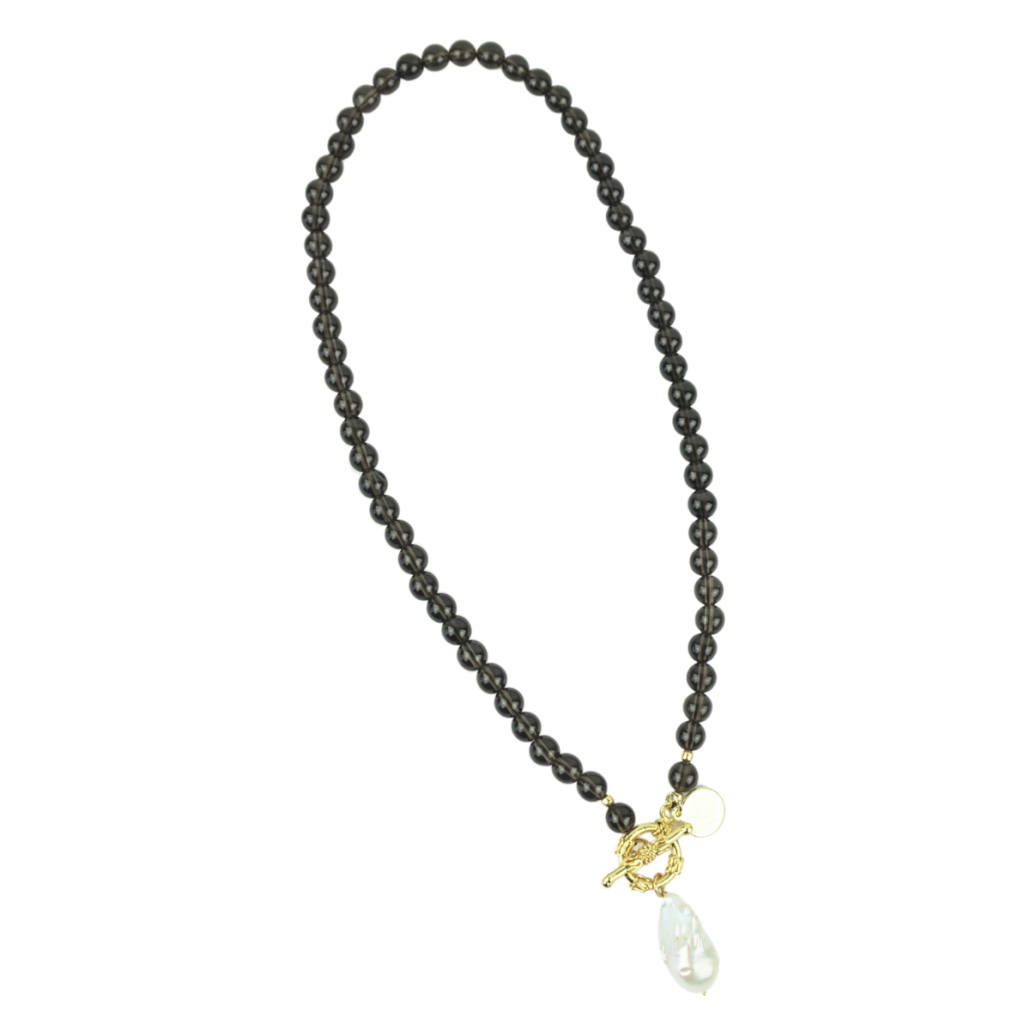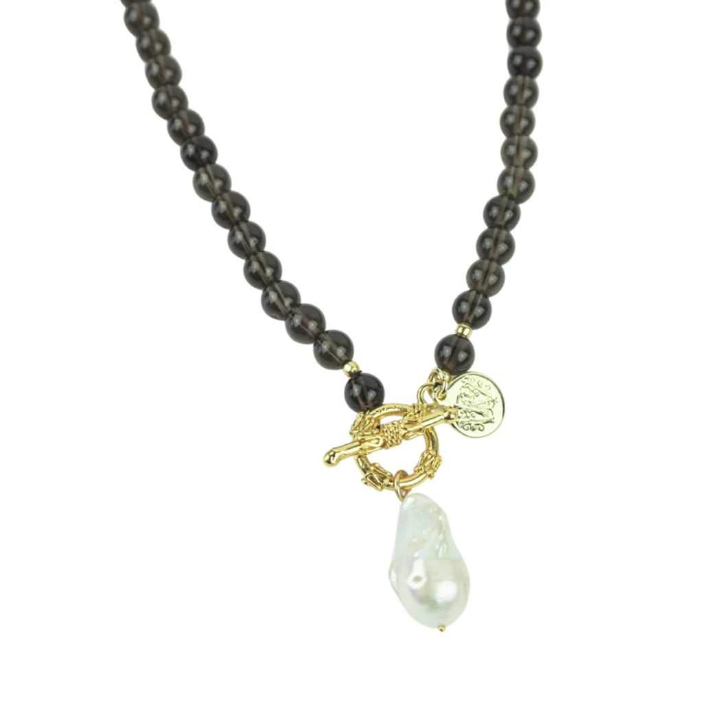 The Traber necklace is the entire package – wrapped up with a bow (& a lovely Baroque Pearl!)! Gorgeous smooth semiprecious stones with 22kt GP toggle and stunning baroque pearl pendant! Perfectly punctuates any ensemble whether a white t or a dressy dress!